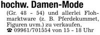 hochw. Damen-Mode(Gr. 48 - 54) und allerlei Flohmarktware (z. B. Pferdekummet, Figuren uvm.) zu verkaufen,_ *** von 15 - 18 Uhr