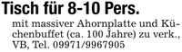 Tisch für 8-10 Pers.mit massiver Ahornplatte und Küchenbuffet (ca. 100 Jahre) zu verk., VB, Tel. ***