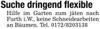 Suche dringend flexibleHilfe im Garten zum jäten nach Furth i.W., keine Schneidearbeiten an Bäumen. Tel. ***