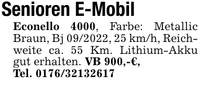 Senioren E-Mobil Econello 4000, Farbe: Metallic Braun, Bj ***, 25 km/h, Reichweite ca. 55 Km. Lithium-Akku gut erhalten. VB 900,-€, Tel. ***