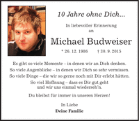10 Jahre ohne Dich... In liebevoller Erinnerung an Michael Budweiser * 26. 12. 1986 + 30. 9. 2015 Es gibt so viele Momente - in denen wir an Dich denken. So viele Augenblicke - in denen wir Dich so sehr vermissen. So viele Dinge - die wir so gerne noch mit Dir erlebt hätten. So viel Hoffnung - dass es Dir gut geht und wir uns einmal wiederseh'n. Du bleibst für immer in unseren Herzen! In Liebe Deine Familie