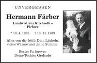 unvergessen Hermann Färber Landwirt aus Kirchroth - Pichsee * 13. 4. 1932 + 13. 11. 1989 Alles von dir fehlt: Dein Lächeln, deine Wärme und deine Stimme. Bester Pa forever. Deine Tochter Gerlinde