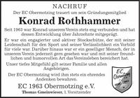 NACHRUF Der EC Obermotzing trauert um sein Gründungsmitglied Konrad Rothhammer Seit 1963 war Konrad unserem Verein stets eng verbunden und hat dessen Entwicklung über Jahrzehnte mitgeprägt. Er war ein engagierter und aktiver Stockschütze, der mit seiner Leidenschaft für den Sport und seiner Verlässlichkeit ein Vorbild für viele war. Darüber hinaus war er ein geselliger Mensch, der in unserem Verein jederzeit gern gesehen war und mit seiner freundlichen und humorvollen Art das Vereinsleben bereichert hat. Unser tiefes Mitgefühl gilt seiner Familie und allen Angehörigen. Der EC Obermotzing wird ihm stets ein ehrendes Andenken bewahren. EC 1963 Obermotzing e.V. Thomas Gmeinwieser, 1. Vorsitzender