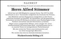 NACHRUF Der Fischereiverein Ettling e.V. trauert um seinen Ehrenvorsitzenden Herrn Alfred Stömmer Alfred war seit 1969 Mitglied in unserem Verein. Von 1977 bis 2006 beeinflusste er als 2. Vorsitzender maßgeblich die Geschicke des Vereines. Sein Weitblick und sein Engagement ermöglichten es dem Verein, zahlreiche Gewässer zu erwerben, die Gerätehalle und das gemeinsame Vereinsheim mit dem SV Ettling zu errichten sowie Nachhaltigkeit in der Fischerei umzusetzen und den Naturschutz zu fördern. Wegen seines ausgeglichenen Wesens, seiner ruhigen Art, seiner Hilfsbereitschaft und seines hohen Fach- und Sachwissens war er in unserem Verein ein hochgeschätzter Fischerkamerad. Mit ihm verliert der Verein einen liebenswerten und vor allem einzigartigen Menschen. Wir werden ihm stets ein ehrendes Gedenken bewahren. Fischereiverein Ettling e.V.