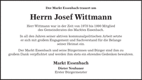 Der Markt Essenbach trauert um Herrn Josef Wittmann Herr Wittmann war in der Zeit von 1978 bis 1990 Mitglied des Gemeinderates des Marktes Essenbach. In all den Jahren seiner aktiven kommunalpolitischen Arbeit setzte er sich mit großem Engagement und Sachverstand für die Belange seiner Heimat ein. Der Markt Essenbach und seine Bürgerinnen und Bürger sind ihm zu großem Dank verpflichtet und werden ihm stets ein ehrendes Gedenken bewahren. Markt Essenbach Dieter Neubauer Erster Bürgermeister