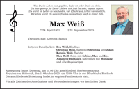Was Du im Leben hast gegeben, dafür ist jeder Dank zu klein. Du hast gesorgt für Deine Lieben, von früh bis spät, tagaus, tagein. Du warst im Leben so bescheiden, nur Pflicht und Arbeit kanntest Du. Mit allem warst Du stets zufrieden, nun schlafe sanft in stiller Ruh. Max Weiß * 29. April 1951 _ 28. September 2025 Thenried, Bad Kötzting, Passau In tiefer Dankbarkeit Eva Weiß, Ehefrau Christian Weiß, Sohn mit Christina und Jakob Kerstin Weiß, Tochter Max Weiß, Sohn mit Sabine, Max und Leo Anneliese Hofbauer, Schwester mit Wolfgang und alle Angehörigen Aussegnung heute, Dienstag, um 18.00 Uhr; anschließend Sterberosenkranz. Requiem am Mittwoch, den 1. Oktober 2025, um 15.00 Uhr in der Pfarrkirche Rimbach. Die anschließende Beisetzung findet im engsten Familienkreis statt. Für alle Zeichen der Anteilnahme und Verbundenheit sagen wir herzlichen Dank.
