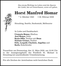 Das einzig Wichtige im Leben sind die Spurender Liebe, die wir hinterlassen, wenn wir gehen.Horst Manfred Homar* 4. Oktober 1940 _ 22. Februar 2026Straubing, Seattle, Snohomish, MelbourneIn Liebe und Dankbarkeit:Utemaria Homar, EhefrauAxel Homar, SohnKarin Offin, Tochter mit DeanStefanie Greiner, TochterFelix, Leopold, Charlotte, Angelina undKarla, EnkelkinderTrauerfeier am Donnerstag, den 12. März 2026, um 10.00 Uhr in der Aussegnungshalle des Friedhofs St. Michael inStraubing mit anschließender Urnenbeisetzung.Für alle Zeichen der Anteilnahme recht herzlichen Dank.