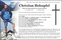 Wenn dich unsere Liebe hätte retten können, hättest du ewig gelebt. Christian Holzapfel Träger der Bürgermedaille der Gemeinde Miltach * 23. August 1974 + 28. März 2026 Oberndorf, Bad Kötzting, Kolmberg und Beckendorf Traurig, aber mit vielen schönen Erinnerungen, nehmen Abschied: Deine Birgit Deine Söhne Bastian mit Melanie, Simon mit Anna-Maria, Elias Deine Eltern Rudi und Erika Holzapfel Deine Schwester Sandra Mühlbauer mit Mario und Tim Dein Patenkind Lea Mühlbauer Deine Schwiegereltern Sepp und Renate Speckner Dein Schwager Sepp Speckner mit Familie Deine Schwägerin Karin Sutter mit Familie Dein Wegbegleiter Albert Schedlbauer mit Familie im Namen aller Verwandten Der Trauergottesdienst mit anschließender Beerdigung findet am Mittwoch, den 1. April 2026, um 10.00 Uhr in der Pfarrkirche Miltach statt. Vorher um 9.00 Uhr ist die Aussegnung am Friedhof, anschließend beten wir den Sterberosenkranz. Anstelle von Kränzen und Blumen erbitten wir im Sinne des Verstorbenen um eine Spende an KUNO, DE***, Kennwort: 'Christian Holzapfel'. Alle Zeichen der Anteilnahme, Hilfsbereitschaft und Verbundenheit während der letzten Monate haben uns tief berührt. Wir sagen allen von Herzen 'DANKE'.