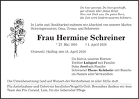 Du hast gesorgt, Du hast geschafft, gar oftmals über Deine Kraft. Nun ruh Dich aus, Du gutes Herz, die Zeit wird lindern unseren Schmerz. In Liebe und Dankbarkeit nahmen wir Abschied von unserer Mutter, Schwiegermutter, Oma, Uroma und Schwester Frau Hermine Schreiner * 27. Mai 1935 + 1. April 2026 Ottenzell, Halfing, den 14. April 2026 Du bist in unseren Herzen: Tochter Luitgard mit Familie Sohn Josef mit Familie Schwester Theres Kelnhofer mit Familie im Namen aller Verwandten Die Urnenbeisetzung fand auf Wunsch der Verstorbenen in aller Stille statt. Für Anteilnahme und Gebet ein herzliches Vergelt's Gott. Besonders danken wir dem Team des Pro Curand, Lam, für die liebevoller Pflege.