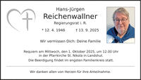 Hans-Jürgen Reichenwallner Regierungsrat i. R. * 12. 4. 1946 _ 13. 9. 2025 Wir vermissen Dich: Deine Familie Requiem am Mittwoch, den 1. Oktober 2025, um 12.00 Uhr in der Pfarrkirche St. Nikola in Landshut. Die Beerdigung findet im engsten Familienkreis statt. Wir danken allen von Herzen für ihre Anteilnahme.