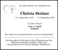 In Liebe nehmen wir Abschied von Christa Steiner * 15. September 1932 _ 3. September 2025 In stiller Trauer: Gaby mit Rudi Sieglinde Wir haben uns im Familienkreis von ihr verabschiedet. Ein besonderer Dank geht an das Pflegepersonal des Magdalenenheimes Landshut und an die Hausarztpraxis Dr. Beischl-Hangen-Winklbauer.