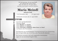 Du hast gesorgt, Du hast geschafft, gar oftmals über Deine Kraft. Nun ruh Dich aus, Du gutes Herz, die Zeit wird lindern unseren Schmerz. Maria Meindl geborene Liebl * 28. November 1961 + 8. April 2026 Drittenzell, Arrach, den 14. April 2026 In Liebe und Dankbarkeit: Ehemann Josef Sohn Matthias mit Nicole Sohn Andreas mit Johanna Enkel Alexandra, Stephanie, Anna-Lena und Josef im Namen aller Verwandten Das Requiem mit anschließender Urnenbeisetzung ist am Donnerstag, den 16. April 2026, um 15.00 Uhr in der Pfarrkirche Haibühl. Für bereits erwiesene und noch zugedachte Anteilnahme sagen wir ein herzliches Vergelt's Gott.