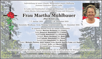 Auferstehung ist unser Glaube, Wiedersehen unsere Hoffnung, frommes Andenken unsere Liebe. In Liebe und Dankbarkeit nehmen wir Abschied von unserer lieben Mutter, Schwiegermutter, Oma, Uroma und Schwester Frau Martha Mühlbauer 'Bihei Becken' * 7. Januar 1939 + 29. Dezember 2025 Steinbühl, Weidhaus, Grub, Wiesing, Grafenwiesen, den 31. Dezember 2025 In unseren Herzen wirst du immer weiterleben: Tochter Martina Bielmeier mit Franz Sohn Heinrich Mühlbauer mit Claudia Sohn Georg Mühlbauer mit Elisabeth Tochter Maria Bielmeier mit Rudi Sohn Johann Mühlbauer mit Tanja Tochter Eva Mühlbauer mit Walter Enkel: Melanie, Patrick, Julia, Sophie, Lisa, Katrin, Hanna, Lena und Sophia Urenkel: Felix und Moritz im Namen aller Verwandten Das Requiem feiern wir am Freitag, den 2. Januar 2026, um 14.30 Uhr in der St. Nikolauskirche Steinbühl. Die anschließende Beisetzung findet im Familienkreis statt. Herzlichen Dank für alle Zeichen der Anteilnahme und Verbundenheit.