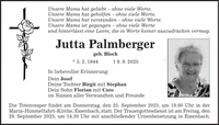 Unsere Mama hat geliebt - ohne viele Worte. Unsere Mama hat geholfen - ohne viele Worte. Unsere Mama hat verstanden - ohne viele Worte. Unsere Mama ist gegangen - ohne viele Worte und hinterlässt eine Leere, die in Worte keiner auszudrücken vermag. Jutta Palmberger geb. Bloch * 5. 2. 1944 + 8. 9. 2025 In liebevoller Erinnerung: Dein Josef Deine Tochter Birgit mit Stephan Dein Sohn Florian mit Caro im Namen aller Verwandten und Freunde Die Totenvesper findet am Donnerstag, den 25. September 2025, um 18.00 Uhr in der Mariä-Himmelfahrt-Kirche, Essenbach, statt. Der Trauergottesdienst ist am Freitag, den 26. September 2025, um 14.30 Uhr mit anschließender Urnenbeisetzung in Essenbach.