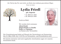 Der Tod ist das Tor zum Licht, am Ende eines mühsam gewordenen Weges. Franz von Assisi Lydia Friedl geb. Augustin * 15. Februar 1953 _ 28. Februar 2026 Furth im Wald Wir werden dich vermissen: Alfred Friedl Jürgen Friedl mit Claudia Paula und Valentina im Namen aller Verwandten Die Urnenbeisetzung findet auf Wunsch der Verstorbenen am Donnerstag, den 12. März 2026, um 11.00 Uhr im Verwandten- und Freundeskreis statt. Für bereits erwiesene und noch zugedachte Anteilnahme sagen wir unseren herzlichsten Dank.