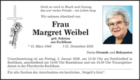 Denk an mich in Musik und Gesang,das war meine Freude - ein Leben lang.Wir nehmen Abschied vonFrauMargret Weibelgeb. Fahrion aus Eschlkam* 13. März 1940 _ 21. Dezember 2025Urnenbeisetzung ist am Freitag, 2. Januar 2026, um 13.30 Uhr am Pestfriedhof in Eschlkam, anschließend um 14.00 Uhr Rosenkranz und um 14.30 Uhr Trauergottesdienst in der Pfarrkirche Eschlkam. Für alle Zeichen der Anteilnahme ein herzliches ,,Vergelt's Gott".Deine Freunde und Bekannten
