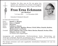 Dankbar für alles, was sie für uns getan hat, nehmen wir Abschied von unserer herzensguten Mutter, Schwiegermutter, Oma, Uroma und Tante Frau Erna Eckmann geb. Miethaner * 10. Juni 1931 + 4. November 2025 Ichendorf, Denkzell, Konzell In liebevoller Erinnerung: Sohn: Rudolf mit Martina Tochter: Erna mit Rudolf Tochter: Hannelore Sohn: Ludwig mit Renate Enkel: Andrea, Kristina, Matthias, Werner, Ulrich, Tobias, Daniela, Kathrin, Michael, Josef und Florian Urenkel: Enrico, Ramona, Tim, Leonie, Marie, Bastian, Hannah, Joschua, Elias, Johannes, Leon und Anja im Namen aller Angehörigen Aussegnung mit anschließendem Sterberosenkranz heute, Donnerstag, um 19.00 Uhr in Konzell. Requiem am Samstag, den 8. November 2025, um 10.00 Uhr in der Pfarrkirche Konzell, anschließend Beerdigung. Für bereits erwiesene und noch zugedachte Anteilnahme bedanken wir uns von ganzem Herzen.