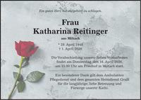 Ein gutes Herz hat aufgehört zu schlagen. Frau Katharina Reitinger aus Miltach * 29. April 1948 + 1. April 2026 Die Verabschiedung unserer lieben Verstorbenen findet am Donnerstag, den 16. April 2026, um 15.00 Uhr am Friedhof in Miltach statt. Ein besonderer Dank gilt dem Ambulanten Pflegedienst und dem gesamten Heimdienst Graßl für die langjährige, liebe Betreuung und Fürsorge unserer Kathi.