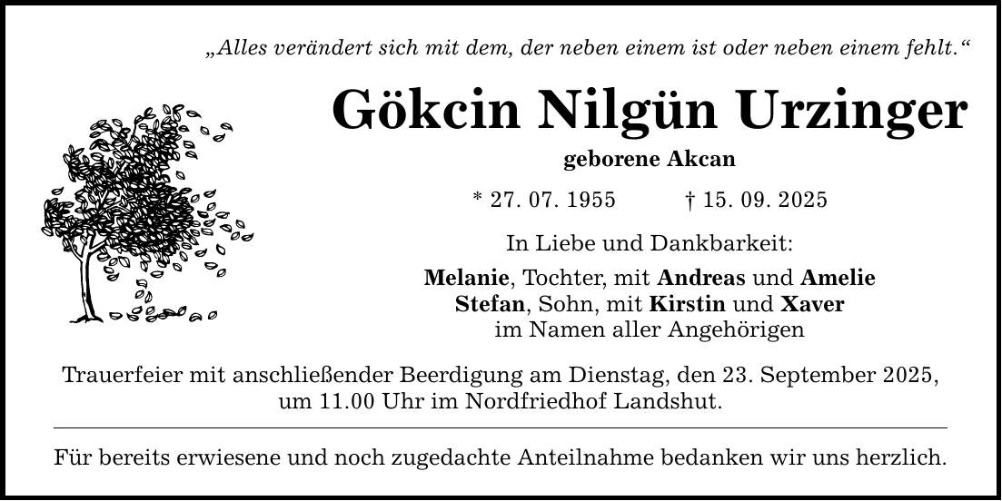 "Alles verändert sich mit dem, der neben einem ist oder neben einem fehlt." Gökcin Nilgün Urzinger geborene Akcan * 27. 07. 1955 _ 15. 09. 2025 In Liebe und Dankbarkeit: Melanie, Tochter, mit Andreas und Amelie Stefan, Sohn, mit Kirstin und Xaver im Namen aller Angehörigen Trauerfeier mit anschließender Beerdigung am Dienstag, den 23. September 2025, um 11.00 Uhr im Nordfriedhof Landshut. Für bereits erwiesene und noch zugedachte Anteilnahme bedanken wir uns herzlich.