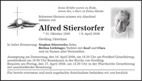 Seine Kräfte waren zu Ende, nimm ihn, o Herr, in Deine Hände. Schweren Herzens müssen wir Abschied nehmen von Alfred Stierstorfer * 21. Oktober 1938 + 9. April 2026 Greißing, Osterham In lieber Erinnerung: Stephan Stierstorfer, Sohn Bettina Lichtinger, Tochter mit Josef und Clara und im Namen aller Verwandten Aussegnung am Donnerstag, den 16. April 2026, um 18.30 Uhr am Friedhof Geiselhöring; anschließend um 19.00 Uhr Rosenkranz in der Kirche von Greißing. Requiem am Freitag, den 17. April 2026, um 14.30 Uhr in der Pfarrkirche Geiselhöring mit anschließender Beisetzung. Für bereits erwiesene und noch zugedachte Anteilnahme bedanken wir uns herzlich.