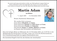 Du warst noch jung und starbst so früh, wer Dich gekannt vergisst Dich nie. Drum schlummre sanft und ungetrübt, Du wirst ja von uns fort geliebt. Und reichst im Jenseits uns einst die Hand beim Wiedersehn im fernen Land. Martin Adam aus Brünst * 1. April 1987 + 6. November 2025 Brünst, Stachesried, Hohenwarth Wir werden Dich vermissen: Deine Eltern Elisabeth und Anton Deine Schwester Daniela mit Sebi, Lucas und Lena Deine Schwester Claudia mit Sebastian Dein Bruder Stefan mit Andrea, Michael und Luisa im Namen aller Verwandten und Bekannten Feier der heiligen Messe am Mittwoch, den 19. November 2025, um 14.00 Uhr in der Wallfahrtskirche Neukirchen b. Hl. Blut, vorher um 13.30 Uhr Sterberosenkranz. Die Urnenbeisetzung findet im engsten Familienkreis statt. Ein herzliches Vergelt's Gott für alle Zeichen der Anteilnahme.