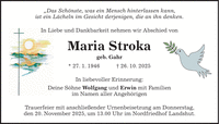 'Das Schönste, was ein Mensch hinterlassen kann, ist ein Lächeln im Gesicht derjenigen, die an ihn denken. In Liebe und Dankbarkeit nehmen wir Abschied von Maria Stroka geb. Gahr * 27. 1. 1946 + 26. 10. 2025 In liebevoller Erinnerung: Deine Söhne Wolfgang und Erwin mit Familien im Namen aller Angehörigen Trauerfeier mit anschließender Urnenbeisetzung am Donnerstag, den 20. November 2025, um 13.00 Uhr im Nordfriedhof Landshut.