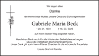 Wir sagen allen Danke die meine liebe Mutter, unsere Oma und Schwiegermutter Gabriele Maria Beck * 28. 01. 1931 + 16. 03. 2026 auf ihrem letzten Weg begleitet haben. Herzlichen Dank auch für alle tröstenden Beileidsbekundungen sowie die vielfältigen Blumenarrangements. Unser Dank gilt auch Herrn Pfarrer Zinecker für die würdevolle Trauerfeier. Ursula Graf mit Familie