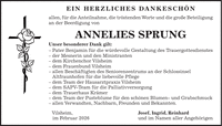 EIN HERZLICHES DANKESCHÖN allen, für die Anteilnahme, die tröstenden Worte und die große Beteiligung an der Beerdigung von ANNELIES SPRUNG Unser besonderer Dank gilt: - Pater Benjamin für die würdevolle Gestaltung des Trauergottesdienstes - der Mesnerin und den Ministranten - dem Kirchenchor Vilsheim - dem Frauenbund Vilsheim - allen Beschäftigten des Seniorenzentrums an der Schlossinsel Altfraunhofen für die liebevolle Pflege - dem Team der Hausarztpraxis Vilsheim - dem SAPV-Team für die Palliativversorgung - dem Trauerhaus Krämer - dem Team der Pusteblume für den schönen Blumen- und Grabschmuck - allen Verwandten, Nachbarn, Freunden und Bekannten. Vilsheim, Josef, Ingrid, Reinhard im Februar 2026 und im Namen aller Angehörigen