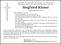 Herzliches 'Vergelt's Gott' für die große Anteilnahme und Wertschätzung, die unserem lieben Mann, Vater und Opa Siegfried Kirner entgegengebracht wurde. Wir bedanken uns bei - allen Trauergästen für die Teilnahme - allen Vereinen für die persönlichen Reden - der Pfarrei Hohenthann mit Pfarrer Gierl, Michael Hirsch und den Ministranten - dem Bestattungsinstitut Heiß mit Max Lederer für die kompetente Unterstützung - den Dres. Raphael, Emanuel und Klaus Schneider mit Belegschaft für die hervorragende Betreuung - dem Team vom Pflegedienst Gerbeth sowie der Spitalstiftung Pattendorf für die liebevolle Pflege. Großer Dank gilt außerdem dem Kirchenchor Hohenthann, dem Musikduo Amabile, Schützenbruder Bartholomäus Hüttner für die angefertigte Holzurne, Stephanie Stadler und Sonja's Blumenwiese für den geschmackvollen Trauerschmuck und dem Team vom Brauereigasthof Hohenthann. Danke vielmals für die tröstenden Gesten in Wort und Schrift, die vielen Umarmungen und die schönen Blumen. Resi Kirner, Ehefrau Monika Kirner und Siegfried Kirner jun. mit Familien