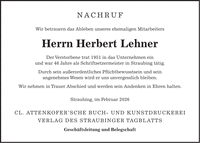 Nachruf Wir betrauern das Ableben unseres ehemaligen Mitarbeiters Herrn Herbert Lehner Der Verstorbene trat 1951 in das Unternehmen ein und war 46 Jahre als Schriftsetzermeister in Straubing tätig. Durch sein außerordentliches Pflichtbewusstsein und sein angenehmes Wesen wird er uns unvergesslich bleiben. Wir nehmen in Trauer Abschied und werden sein Andenken in Ehren halten. Straubing, im Februar 2026 Cl. Attenkofer'sche Buch- und Kunstdruckerei Verlag des Straubinger Tagblatts Geschäftsleitung und Belegschaft