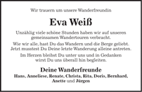Wir trauern um unsere Wanderfreundin Eva Weiß Unzählig viele schöne Stunden haben wir auf unseren gemeinsamen Wandertouren verbracht. Wie wir alle, hast Du das Wandern und die Berge geliebt. Jetzt musstest Du Deine letzte Wanderung alleine antreten. Im Herzen bleibst Du unter uns und in Gedanken wirst Du uns überall hin begleiten. Deine Wanderfreunde Hans, Anneliese, Renate, Christa, Rita, Doris, Bernhard, Anette und Jürgen