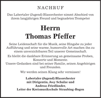 NACHRUF Das Labertaler (Jugend) Blasorchester nimmt Abschied von ihrem langjährigen Freund und begnadeten Trompeter Herrn Thomas Pfeffer Seine Leidenschaft für die Musik, seine Hingabe zu jeder Aufführung und seine warme, humorvolle Art machen ihn zu einem unverzichtbaren Teil unserer Gemeinschaft. Es bleibt die dankbare Erinnerung an gemeinsame Proben, Konzerte und Momente. Unsere Gedanken sind bei seiner Familie, seinen Angehörigen und Freunden. Wir werden seinen Klang sehr vermissen! Labertaler (Jugend) Blasorchester mit Dirigentin, Josy Schulze und Andreas Friedländer, Leiter der Kreismusikschule Straubing-Bogen