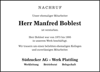NACHRUF Unser ehemaliger Mitarbeiter Herr Manfred Boblest ist verstorben. Herr Boblest war von 1975 bis 1995 in unserem Werk beschäftigt. Wir trauern um einen beliebten ehemaligen Kollegen und zuverlässigen Mitarbeiter. Südzucker AG - Werk Plattling Werkleitung Betriebsrat Belegschaft
