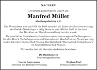 NACHRUF Der Bezirk Niederbayern trauert um Manfred Müller Abteilungsdirektor a. D. Der Verstorbene war von 1976 bis 1986 zunächst als Leiter der Sozialverwaltung des Bezirks Niederbayern tätig, bevor er von 1988 bis 2000 in das Amt des Direktors der Bezirksverwaltung berufen wurde. Als juristischer Staatsbeamter brachte er seine herausragende Fachkompetenz für den Bezirk Niederbayern ein und übernahm als Geschäftsleiter Verantwortung in den Zweckverbänden Bad Füssing, Bad Griesbach, Thermalbad Birnbach sowie im Kurmittelhaus Bad Abbach. Wir werden ihm ein ehrendes Andenken bewahren. Dr. Olaf Heinrich Bezirkstagspräsident Lorenz Angermann Stephan Engl Direktor der Bezirksverwaltung Personalratsvorsitzender
