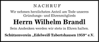 NACHRUFWir nehmen herzlichsten Anteil am Tode unseresGründungs- und EhrenmitgliedsHerrn Wilhelm BrandlSein Andenken werden wir stets in Ehren halten.Schützenverein "Edelweiß Tabertshausen 1959" e.V.