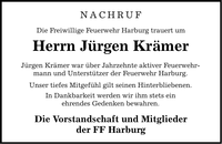 NACHRUF Die Freiwillige Feuerwehr Harburg trauert um Herrn Jürgen Krämer Jürgen Krämer war über Jahrzehnte aktiver Feuerwehrmann und Unterstützer der Feuerwehr Harburg. Unser tiefes Mitgefühl gilt seinen Hinterbliebenen. In Dankbarkeit werden wir ihm stets ein ehrendes Gedenken bewahren. Die Vorstandschaft und Mitglieder der FF Harburg