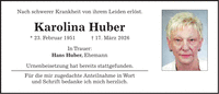 Nach schwerer Krankheit von ihrem Leiden erlöst. Karolina Huber * 23. Februar 1951 + 17. März 2026 In Trauer: Hans Huber, Ehemann Urnenbeisetzung hat bereits stattgefunden. Für die mir zugedachte Anteilnahme in Wort und Schrift bedanke ich mich herzlich.