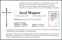 Du bist in all unserem Denken, noch begreifen wir es nicht. Du bist in all unserem Tun, dabei vermissen wir Dich. Du bist vor unseren Augen, doch sehen wir Dich nicht, aber Du bist in unseren Herzen, und dort behalten wir Dich. Josef Wagner * 21. November 1955 + 25. Dezember 2025 Schierling, Allkofen, den 10. Januar 2026 Judith mit Samuel Claudia mit Andreas Detlef mit Familie Daniela mit Familie Bernd mit Familie Trauerfeier am Donnerstag, den 15. Januar 2026, um 14.00 Uhr auf dem Friedhof in Schierling, anschließend Urnenbeisetzung. Anstelle von Kränzen und Blumen bitten wir um eine Spende an die Deutsche Myasthenie Gesellschaft e.V., IBAN DE***, Verwendungszweck: 'Myasthenia Gravis Syndrom, Josef Wagner'.