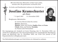 Mit dem Tod eines Menschen verliert man vieles, niemals aber die gemeinsam verbrachte Zeit. In Liebe und Dankbarkeit nehmen wir Abschied von Josef ine Kramschuster geb. Zinner * 3. April 1947 + 6. November 2025 Berghausen, Meilenhofen In unseren Herzen lebst Du weiter. Thomas, Ehemann Thomas, Sohn, mit Töchter Sophia, Lisa und Lena Ulrich, Sohn, mit Tochter Veronika im Namen aller Verwandten Die Aussegnung mit Andacht ist heute Dienstag, den 11. November 2025, um 19.00 Uhr in Berghausen. Der Trauergottesdienst mit anschließender Beerdigung findet am Mittwoch, den 12. November 2025, um 10.00 Uhr jeweils in der Expositurkirche in Berghausen statt. Von Beileidsbekundungen am Grab bitten wir Abstand zu nehmen.
