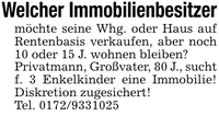 Welcher Immobilienbesitzermöchte seine Whg. oder Haus auf Rentenbasis verkaufen, aber noch 10 oder 15 J. wohnen bleiben?Privatmann, Großvater, 80 J., sucht f. 3 Enkelkinder eine Immobilie! Diskretion zugesichert!Tel. ***