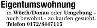 Eigentumswohnungin Wörth/Donau oder Umgebung - auch bewohnt - zu kaufen gesucht. Telefon ***