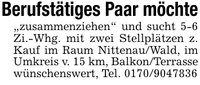 Berufstätiges Paar möchte"zusammenziehen" und sucht 5-6 Zi.-Whg. mit zwei Stellplätzen z. Kauf im Raum Nittenau/Wald, im Umkreis v. 15 km, Balkon/Terrasse wünschenswert, Tel. ***