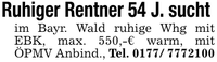 Ruhiger Rentner 54 J. sucht im Bayr. Wald ruhige Whg mit EBK, max. 550,-€ warm, mit ÖPMV Anbind., Tel. ***