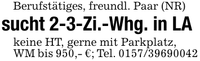 Berufstätiges, freundl. Paar (NR)sucht 2-3-Zi.-Whg. in LAkeine HT, gerne mit Parkplatz,WM bis 950,- €; Tel. ***