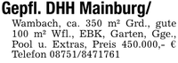 Gepfl. DHH Mainburg/Wambach, ca. 350 m² Grd., gute 100 m² Wfl., EBK, Garten, Gge., Pool u. Extras, Preis 450.000,- € Telefon ***