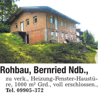 Rohbau, Bernried Ndb., zu verk., Heizung-Fenster-Haustüre, 1000 m² Grd., voll erschlossen., Tel. ***