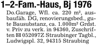 1-2-Fam.-Haus, Bj 1976Do.Garage, Wfl. ca. 220 m², ausbaufäh. DG, renovierungsbed., gute Bausubstanz, ca. 1.000m² Grdst. v. Priv zu verk. in 94360, Zuschriften _ ***Z Straubinger Tagbl., Ludwigspl. 32, 94315 Straubing