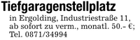 Tiefgaragenstellplatzin Ergolding, Industriestraße 11, ab sofort zu verm., monatl. 50.- €;Tel. ***