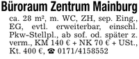 Büroraum Zentrum Mainburgca. 28 m², m. WC, ZH, sep. Eing., EG, evtl. erweiterbar, einschl. Pkw-Stellpl., ab sof. od. später z. verm., KM 140 € + NK 70 € + USt., Kt. 400 €, _ ***