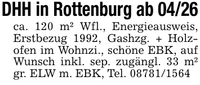 DHH in Rottenburg ab 04/26ca. 120 m² Wfl., Energieausweis, Erstbezug 1992, Gashzg. + Holzofen im Wohnzi., schöne EBK, auf Wunsch inkl. sep. zugängl. 33 m² gr. ELW m. EBK, Tel. ***